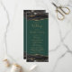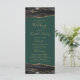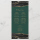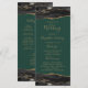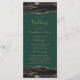 This elegant, modern wedding program features black watercolor agate top and bottom borders trimmed with gold faux glitter. The text appears in elegant gold-colored handwriting and copperplate fonts on an emerald green background.