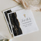 The left-hand edge of this elegant napkin features a black watercolor agate border trimmed with faux gold glitter. A faux gold foil cross appears above the customisable text, which combines handwriting, copperplate and italic fonts in charcoal grey on a white background. Personalise it with the name of the guest of honour and the date.