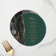 The left-hand side of this elegant modern wedding menu features a black watercolor agate border trimmed with faux gold glitter. The customisable text combines gold-coloured whimsical handwriting script and copperplate fonts on a dark emerald green background. The reverse side features a matching black and gold agate design.