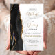 The left-hand edge of this elegant modern wedding invitation features a black watercolor agate border trimmed with faux gold glitter. The customisable text combines gold-coloured handwriting script with black copperplate and italic fonts on a grey and white marble background. The reverse side features a matching black and gold agate design.