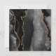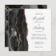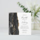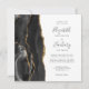 The left-hand side of this elegant modern square wedding invitation features a black watercolor agate border trimmed with faux gold glitter. The customisable text combines handwriting, copperplate and italic fonts in charcoal grey on a white background. The reverse side features a matching black and gold agate design.