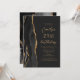 The left-hand edge of this elegant modern birthday party invitation features a black watercolor agate border trimmed with gold faux glitter. The customisable text combines gold-coloured script and sans serif fonts on a slate black background. The reverse side features a matching black and gold agate design.