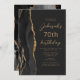 The left-hand edge of this elegant modern birthday party invitation features a black watercolor agate border trimmed with gold faux glitter. The customisable text combines gold-coloured script and sans serif fonts on a slate black background. The reverse side features a matching black and gold agate design.
