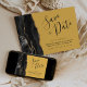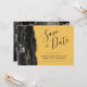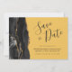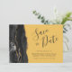 This elegant modern save the date card features a black watercolor agate border trimmed with faux gold glitter. The customisable text combines off-black handwriting script, copperplate and italic fonts on a yellow background. The reverse side features a matching black and gold agate design.