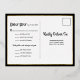 The front of this simple, elegant, chic art deco floral RSVP reply postcard features vintage typography in real gold foil on a black background, surrounded by a minimal border with with retro flowers in the corners, combining sophisticated glamour with minimalism. The back features a black background with a gold-edged white area in the centre, where there is a customisable respond-by date, and blanks for the guests to fill out, including three meal options. There is also customisable text for your return address. You can customise the text by editing the product template to personalise this card for your own wedding.