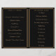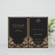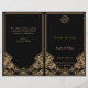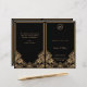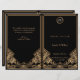 An elegant, vintage style wedding program or order of service with a 1920's "The Great Gatsby" theme in Black and Golden tones. A black background highlights the intricate geometric, Art Deco style border in golden beige tones. The Bride and Groom's monograms are highlighted by using a contrasting silver grey colour font. This beautiful wedding program is designed to be folded down the centre to create a bi-fold card style program.