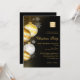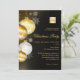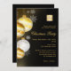 An invitation for a business, company Christmas Party. Classic black background. Decorated with gold and white baubles. Personalise and add your logo, and the party details.