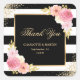 Elegant black and white striped floral wedding thank you stickers featuring watercolor blush pink, ivory and peach flowers and gilded greenery. Easily personalise this template online.