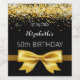 Elegant, classic, glamourous birthday label. Faux gold coloured bow and confetti. Black background. Personalise and add the date, name and age/event.