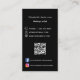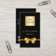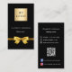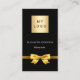 A classic black background. Decorated with a golden bow. Personalise and add your business logo, name, title and contact information. Add your website url/link to the Qr code. With Facebook and Instagram icons. White text.