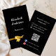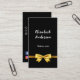 A classic black background. Decorated with a golden bow. Personalise and add your name, title and contact information. Add your website url/link to the Qr code. With Facebook and Instagram icons. White text.
