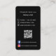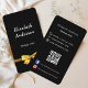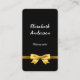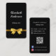 A classic black background. Decorated with a golden bow. Personalise and add your name, title and contact information. Add your website url/link to the Qr code. With Facebook and Instagram icons. White text.