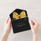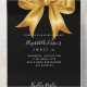 A black background, decorated with a large golden bow. Personalise and add names, party details, RSVP date, return address and name.