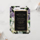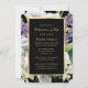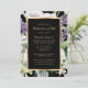 Elegant black and gold floral celebration of life invitation featuring a gold frame adorned with purple flowers, white calla lilies, orchids and greenery. A floral photo frame at the back.