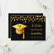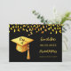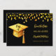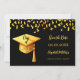 On front: A black background, golden text. Templates for a name and date. The name and the text: Save the Date are written with a modern hand lettered style script. With a faux gold cap, tassel topper.