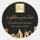 A black background, with a faux gold city skyline as decor. Personalise and add your business logo and a text on front. Golden letters