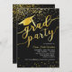 This graduation invitation design features a black background with gold glitter confetti, graduation hat with tassel and "grad party" font.