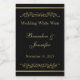 Chic wedding mini wine labels ready for you to personalise with your own information. Elegant black with gold tone accent lines, on the top and bottom of this waterproof label, with graphics of a gold tone elegant flourish, on both the top and bottom, and custom golden yellow text below it. Personalise the text for your wedding reception. Great for your wedding reception table or guest favours.