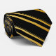 This black tie features alternating thick and fine diagonal gold stripes, creating a sense of movement while maintaining a disciplined, minimalist aesthetic.