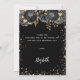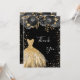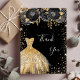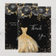 A feminine and elegant birthday thank you card. A black background, with faux gold glitter, sparkles, black roses and a golden dress. On front a large hand lettered script and the text: Thank You.