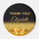 Elegant, classic, glamourous and feminine. A gold coloured bow with golden glitter and sparkle, a bit of bling and luxury. Black background. With the text: Thank You! and template for a name.