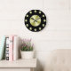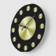 A simple wall clock with a black background, black hands and golden circles to mark the hours and a small golden face. Click Customise It to add your custom text or images, change background colours and more.