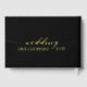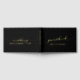 An elegant and sophisticated black and gold wedding guestbook featuring gold foil swash calligraphy with your names on the front, spine and back covers in a modern san serif font. The book reads, "guest book,' on the front and wedding on the back in a swash font script.