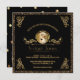 Chic baby boy shower invites in black and gold with touches of Art Deco style- Elegant faux gold metal look scrolls decorate the corners. Centred is a gold metallic effect decorative circle frame and leaf scrolls with a handsome little prince wearing a gold crown, black diaper, slippers, and bow tie, and holding his favourite teddy bear. Below is the mother's name and custom details in gold hued lettering, including RSVP details. Faux gold glitter border accents. Back has black background with gold metallic look polka dots and matching little prince in the lower corner. In sophisticated black and gold. Note: All images are printed. Not actual glitter or metal.