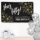 Fifty Black Gold 50th Birthday Party Banner: Make a statement at your event with this stylish 50th birthday banner. Featuring a sophisticated black background adorned with gold flowers, this banner combines classic serif fonts and script typography in white to create a chic look. The text can be personalised to highlight the birthday honoree's name and age, making it perfect for celebrating fifty wonderful years. This beautiful botanical design is fully customisable, allowing you to change the colours of the fonts and flowers to suit your theme. Ideal for a party or event, this banner adds a touch of charm and elegance to any celebration.