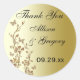 This 1.5" round amber gold and black floral wedding favour sticker or envelope seal has SIMULATED coppery gold glitter butterflies and flowery vines on it that matches the wedding invitation shown below. **NOTE, if you change the shape of the sticker yourself, or if you change the fonts, or the size of the font, some of the design and/or text may get cut-off. Everything will print as you see it on your monitor. I will not see changes you make, and Zazzle will NOT correct anything (typos, mis-alignment etc.). The text is all customisable. If you need help with this product, please email me BEFORE you place your order. If you require any other matching items, please email your request to niteowlstudio@gmail.com