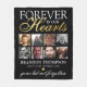 Elegant memorial keepsake blanket featuring 6 square pictures of your lost loved one, the text "forever in our hearts", their name, birth/death dates, a faux gold foil heart, and the remembrance saying "gone but not forgotten".