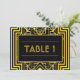 These table numbers feature an intricate geometric frame, geometric patterns, a black and gold colour palette, and other stylistic details all inspired by Art Deco and the roaring twenties. You can customise the sample text fields to your liking.