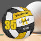 This cute volleyball themed throw pillow features the image of a realistic volleyball that has black, gold and white panels, upon which you can customise the player's name, monogram or varsity letter, team and mascot name, and jersey number on the front and back - the volleyball's black and gold panels are blended with a floral kaleidoscopic pattern for a textured appearance - by katz_d_zynes