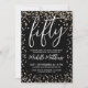 Celebrate the big 5-0 in style with this modern and festive 50th birthday party invitation. The design showcases faux shimmering gold and silver confetti across a sleek black background, with the word "Fifty" highlighted in elegant script at the top. A mix of elegant script and classic serif fonts in crisp white creates a timeless and sophisticated contrast. The back features a solid black background for a simple, polished finish. Perfect for honouring 50 years young, this invitation can be customised with your choice of font and background colours to suit any party theme.