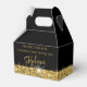 Elegant black and gold faux glitter border party favour box for any occasion with editable "Thank you for celebrating with me" wording and a fun and funky signature script name, and space for your own saying on the back – use the template to create your own small gable favour box for a birthday, bat mitzvah, anniversary, retirement party, bridal shower, baby shower or small personal celebration gathering. Use the Design Tool to edit background colours and fonts.