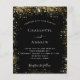 A modern, elegant wedding invitation. Black background decorated with faux gold glitter sparkles. Personalize and add your names and wedding details. White colored letters.