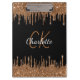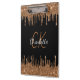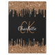 A classic black background with faux dark gold glitter drips, paint dripping look. Personalise and add a name and monogram initials. The name is written with a modern hand lettered style script. White and golden letters.