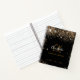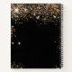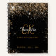 A black background, decorated with faux gold glitter dust. Personalise and add your monogram initials, first name, full name and a title. Golden and white letters.