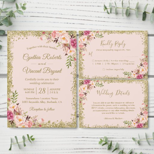Blush Pink Gold Glitters Floral Invitation SuiteDesigned by Scott C.