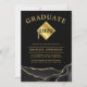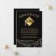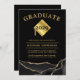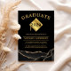 Trendy 2025 graduation announcement card featuring a black background with a gold glitter pattern, a motarboard with the class year on top, the students name, and their future plans.