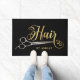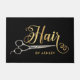 Black & Gold Hairstylist Salon Name Black Doormat . Design Features Calligraphy ''Hair'' in gold color , pair of silver hairdressers scissors on a black background. Personalize with a name or salon name.