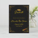 Elegant black and gold high school graduation announcement featuring a sophisticated art deco frame, graduation cap, and diploma accents.