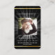 Classic black background, a faux gold frame and space for your photo. Light beams, behind the photo. Personalise and add name, dates and your text and prayer.