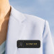 A simple custom icon business name tag template in a modern minimalist style on a sleek black background with gold text. The versatile template can easily be updated with your company logo, graphic or photo, name, title.