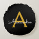 Black Gold Modern Script Girly Monogram Name Round Cushion
