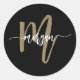 Black Gold Modern Script Monogram Name Classic Round Sticker