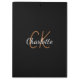 A classic black background. Personalise and add a name and monogram initials. The name is written with a modern hand lettered style script. White and golden letters.