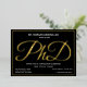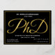 A PhD graduation party invitation with gold foil, white text, and a black background. Simply add your information, add this invitation to your cart, and celebrate this major accomplishment.