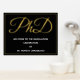 A PhD graduation party welcome sign poster with gold foil, white text, and a black background. Simply add your information, add this poster to your cart, and celebrate this major accomplishment.