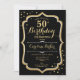 Elegant 50th birthday invitation with your photo at the back of the card. Glam black design with faux glitter gold. Features script font and confetti. Perfect for a stylish adult bday celebration party. Personalise with your own details. Can be customised for any age! Printed Zazzle invitations or instant download digital printable template.